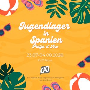 Am 23.07 bis zum 04.08.2026 geht der Bus dieses mal wieder in Richtung Spanien! Wenn ihr zwischen 15 und 17 seid, könnt ihr dabei sein! Ihr findet die Jugendlager 2026 Anmeldung hier und hier alle weiteren Informationen.