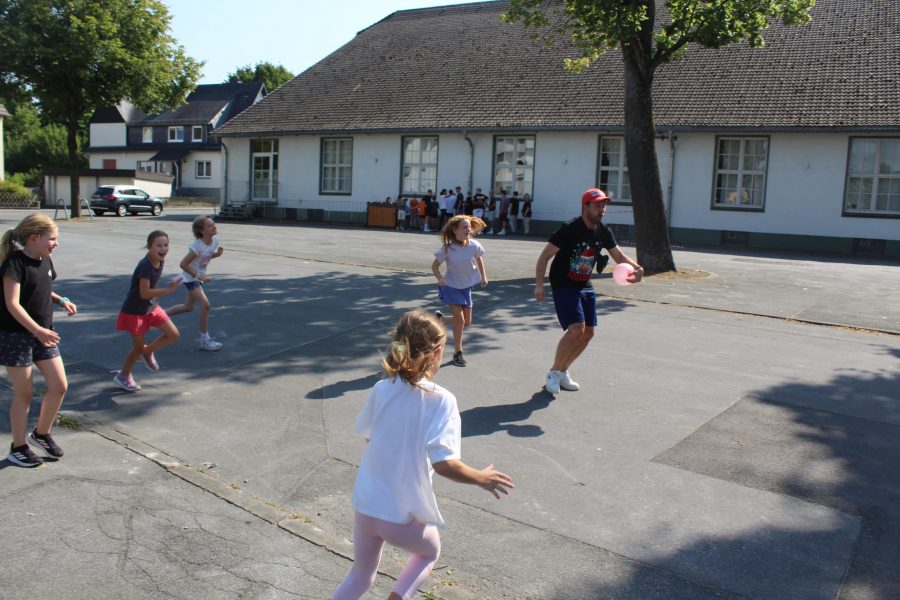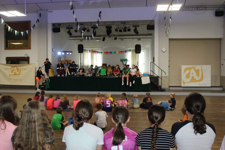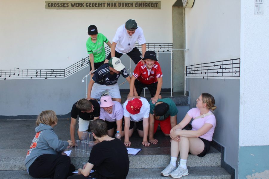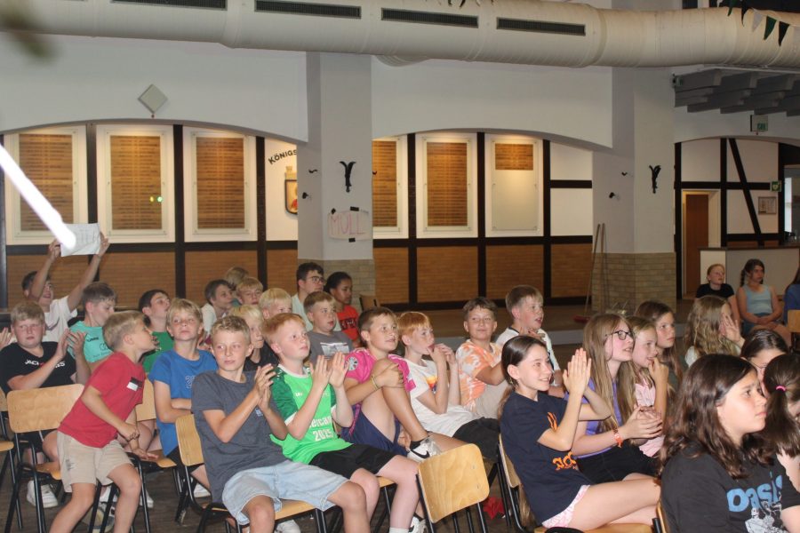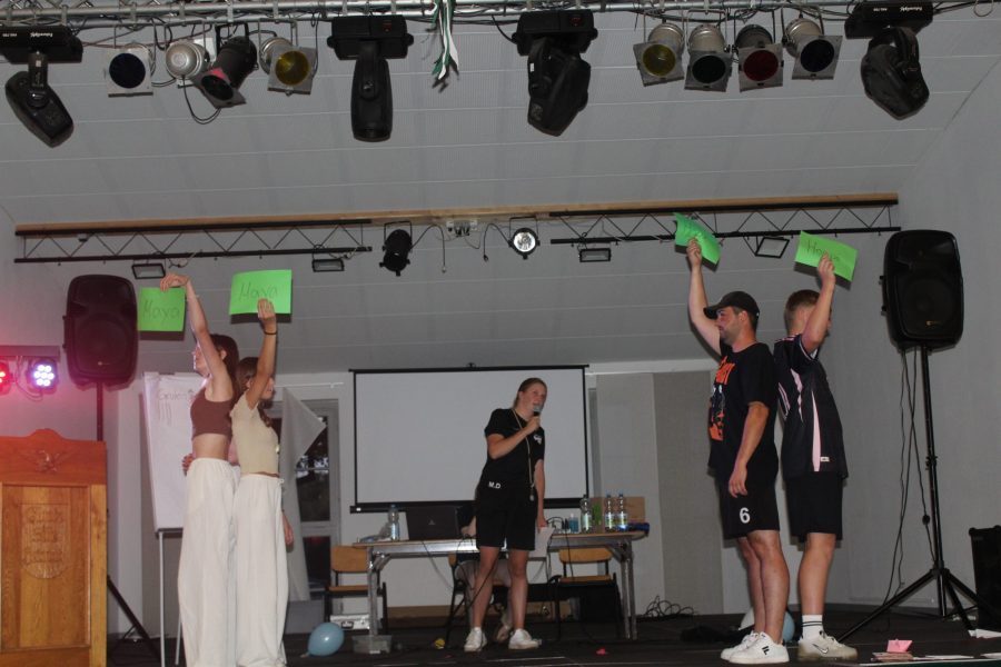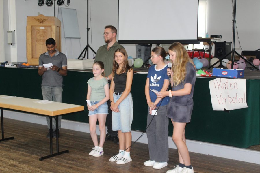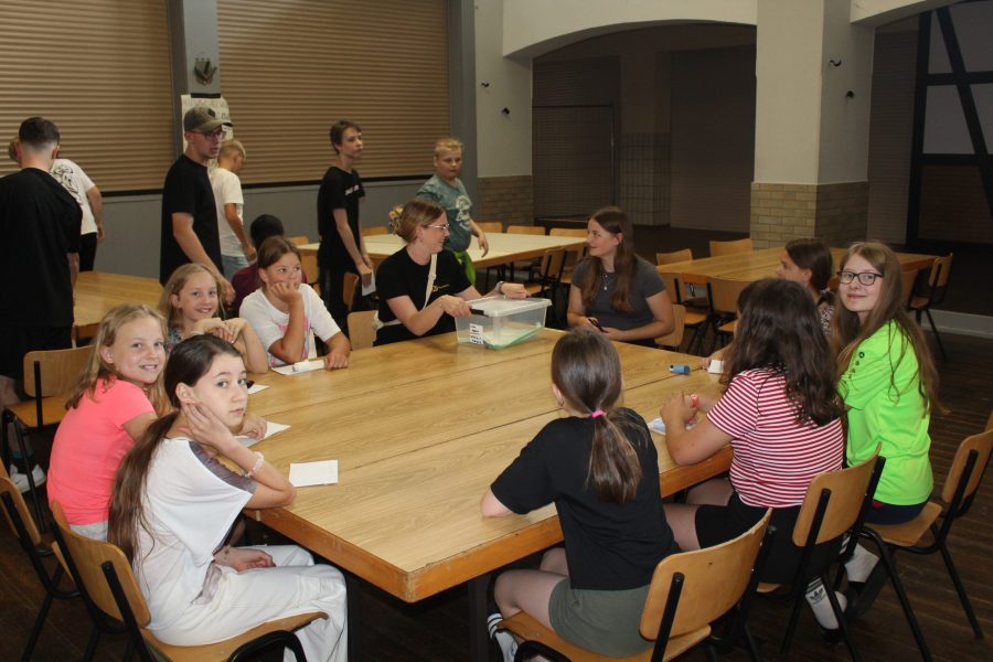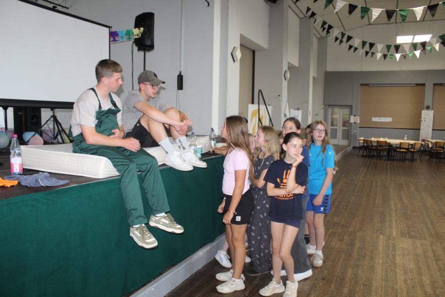 Und man sollte meinen, dass nach einem so anstrengenden Nachmittag im Schwimmbad alle völlig ausgepowert zurück zur Halle kommen. Doch heute Abend geht es um Alles, denn die Kinder treten gegen die Gruppenleiter beim Spiel ,,Schlag den Super-Grulei‘‘ an. Beide Seiten wollen den Sieg unbedingt für sich beanspruchen. Die Stimmung ist voller Spannung. Die Kinder und die Gruppenleiter treten in verschieden Disziplinen und Spielen gegeneinander an. Zum Beispiel musste ein tiefgefrorenes T-Shirt auseinandergefaltet werden, Dinge wie ein Kissen, eine Wasserflasche oder ein Handtuch schnellstmöglich in die Halle gebracht werden und Begriffe pantomimisch erraten werden. Es war ein Kopf-an-Kopf-Rennen und nach vielen Jahren der Niederlage haben es die Gruleis heute tatsächlich geschafft gegen die Kinder zu gewinnen. Das wird in die Geschichtsbücher eingehen.