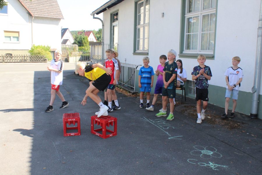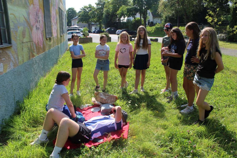 Der vierte Tag unseres Ferienlagers begann wie gewohnt mit einem leckeren Frühstück, das uns für die spannenden Abenteuer des Tages stärkte. Direkt danach startete die altbekannte Grulei-Suche. Unsere Gruppenleiter hatten sich kreativ verkleidet und sich im ganzen Ort versteckt. Die Kinder machten sich begeistert auf die Jagd, suchten die verkleideten „Gruleis“ und versuchten, ihre Verkleidungen zu erraten.