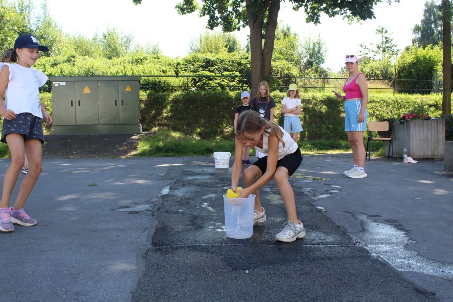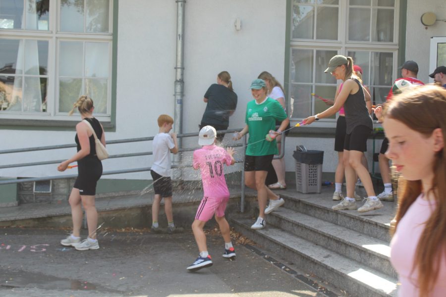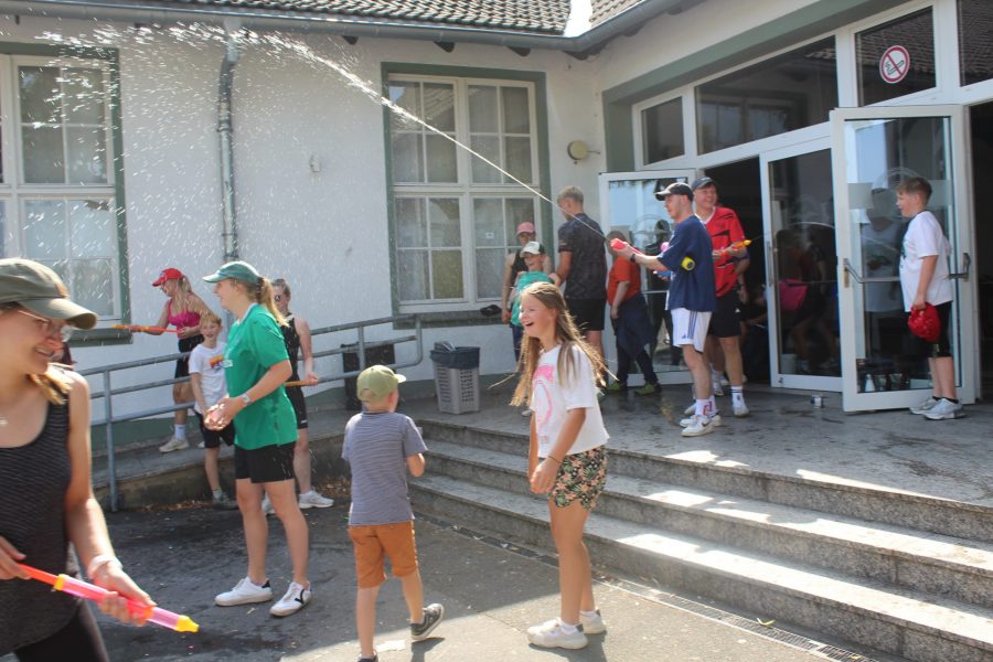 Da das Wetter sommerlich warm war, wartete eine erfrischende Überraschung: Die Gruppenleiter hatten Wasserbomben und Wasserpistolen vorbereitet – eine lustige und kühle Abwechslung, die für viel Gelächter sorgte.