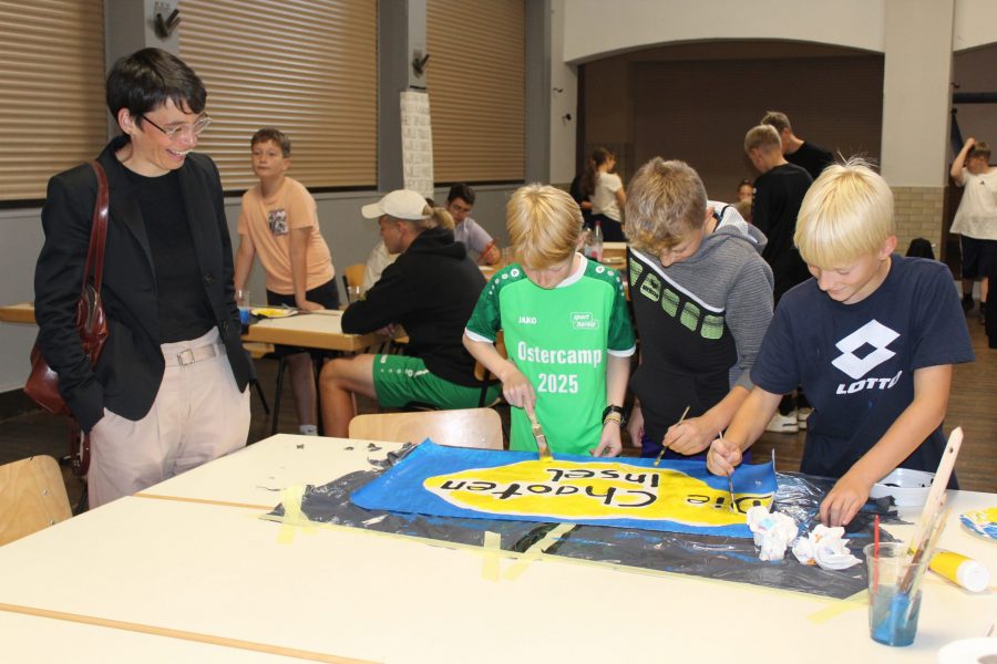 Heute Vormittag hatten wir Besuch von unserem Dachverband der CAJ Münster und Josefine Paul, der Ministerin für Kinder, Jugend, Familie, Gleichstellung, Flucht und Integration des Landes Nordrhein-Westfalen. Wir haben Frau Paul einen kleinen Einblick in unser Lagerleben gegeben und gezeigt wie Kinder- und Jugendarbeit bei uns aussieht. Während des Besuchs von Frau Paul wurden von den Gruppen fleißig die Fahnen für die Olympiade gestaltet und jede Gruppe hat sich passend zum Ländernamen eine Hymne überlegt.