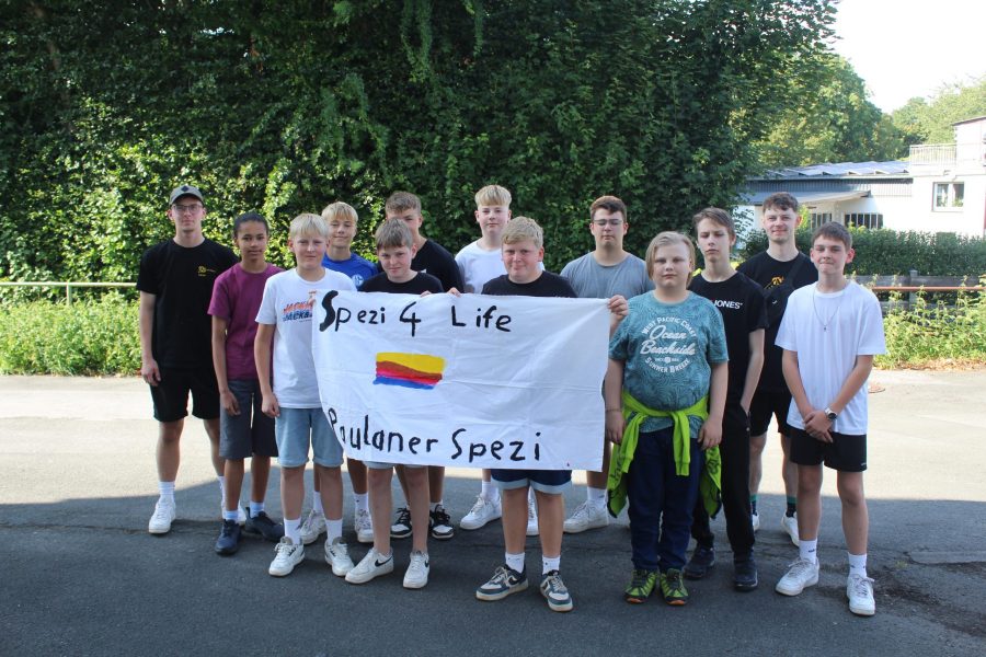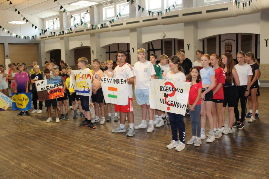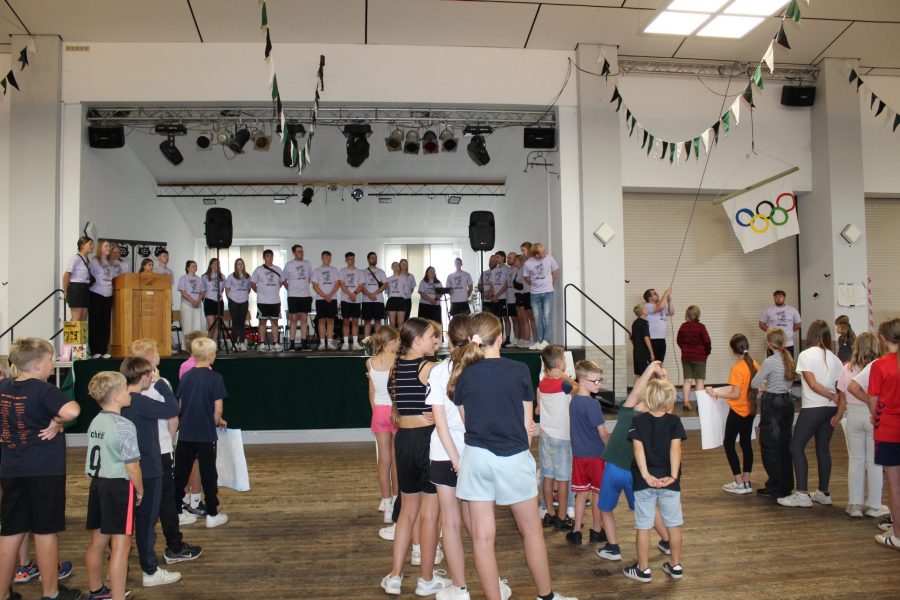 Nach dem Mittagessen startete dann die große Lagerolympiade zu Belecke 2025. Das ganze Team versammelte sich voller Ernst und Anerkennung der sportlichen Herausforderung auf der Bühne. Die Gruppen sind einzeln in die Halle eingelaufen und wurden mit ihrer Hymne empfangen. Es folgte der Einzug der olympischen Flagge, welche im Anschluss von der Versorgung feierlich gehisst wurde.