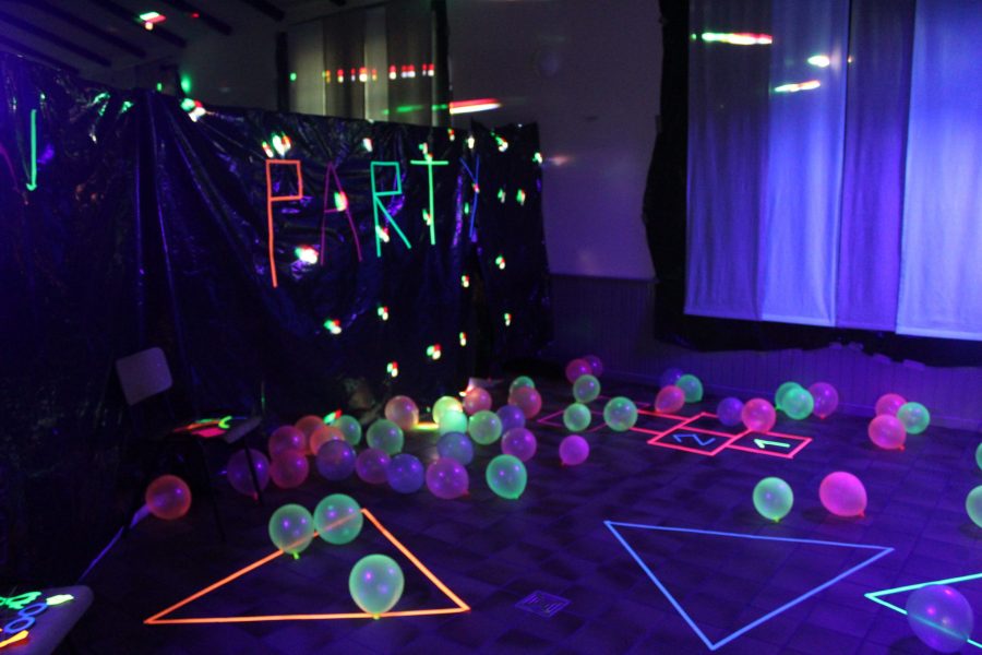 Gerade ist die Schwarzlichtparty im vollen Gange. Emelie, Jule und Thea haben sich mit der Vorbereitung dieses besonderen Abends selber übertroffen. Mit Neonfarbe können sich alle individuell bemalen und der Kreativität freien Lauf lassen. In einem abgedunkelten Bereich der Halle bringen Schwarzlichtröhren, dann die weiße Kleidung und neonfarbenen Bemalungen zum Leuchten – einfach eine ganz besondere Stimmung! Es wurden auch keine Kosten und Mühen gescheut, sodass heute Abend exklusiv für uns DJ Dose auflegt. Sonst ist er auf den Festivals in ganz Europa Zuhause und heute hat er für uns den weiten Weg ins Sauerland auf sich genommen.